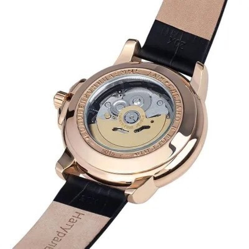 Розовый алтыннан жасалған ерлер сағаты. Шыны артқы қақпақ автоматты механизмнің жұмысын көрсетіп, сағат иесіне уақыттың құпиясын ашуға мүмкіндік береді. Күшті корпус ерекше конструкцияның арқасында завод басының қосымша қорғанысын қамтамасыз етіп, ерекше кең болып көрінеді. Классикалық циферблаттың қаталдығы овальды күн апертурасымен жұмсартылған.