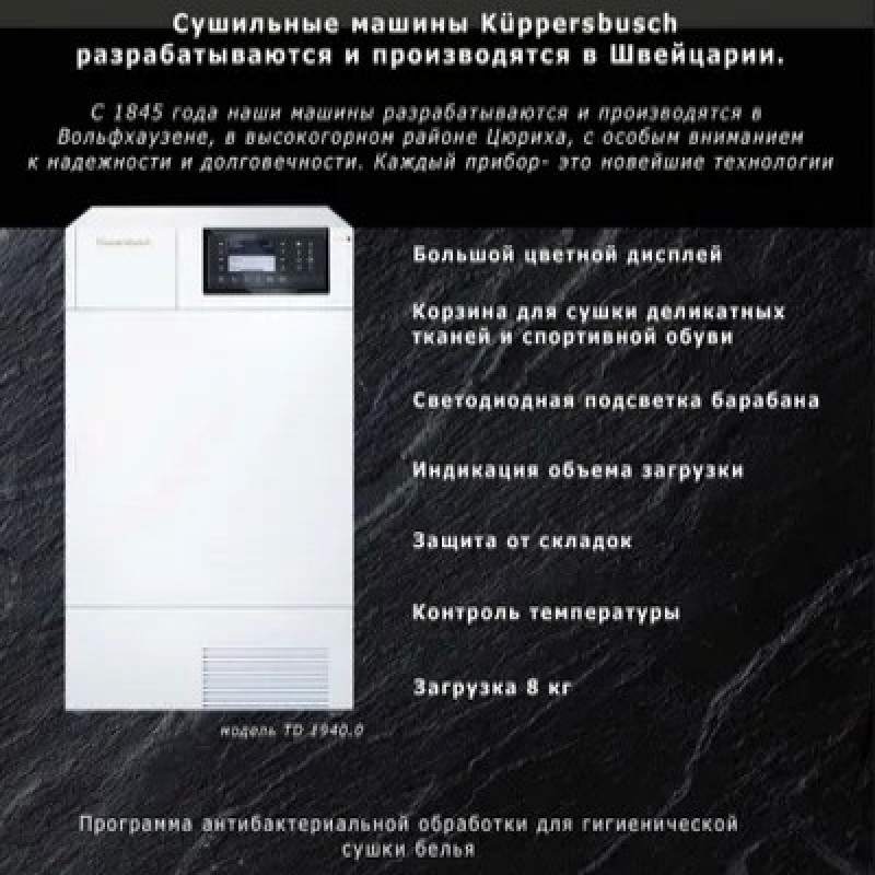 Kuppersbusch кір жуғыш және кептіргіш машиналары Швейцарияда әзірленіп, өндірілген. Сәнділік және ұзақ қызмет ету қабілеті – киім күтімі құрылғылары саласындағы көшбасшылардан.